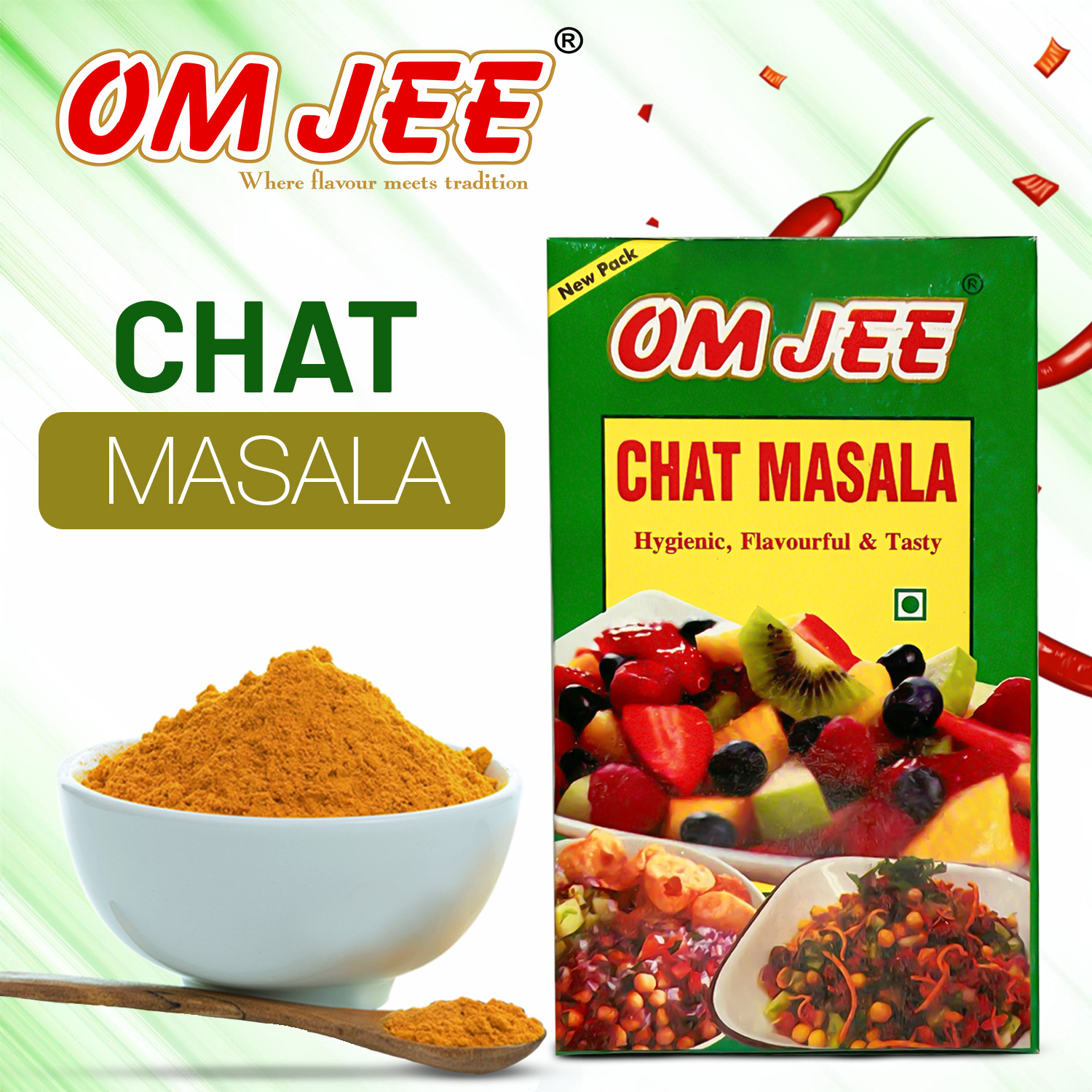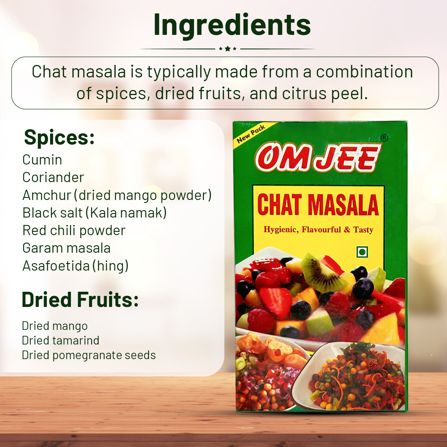 ● Ingredients: White Salt, Dry Mango (Amchur), Cumin, Black Salt, Coriander, Black Pepper, Pomegranate Seeds, Dry Ginger, Chilies, Mint Leaves, Nutmeg, Cloves